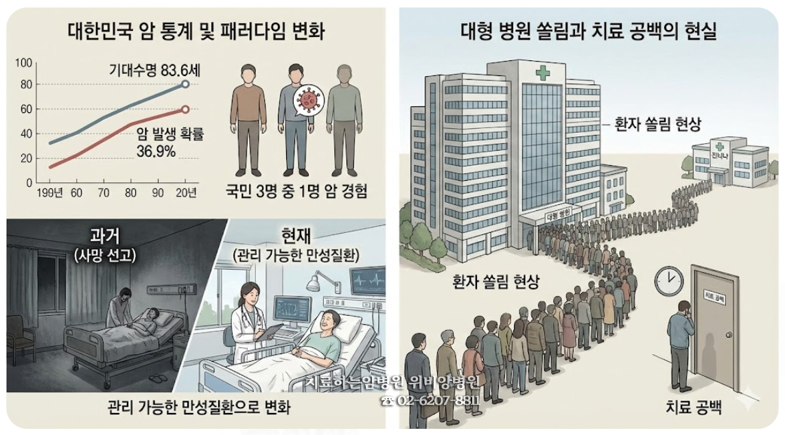 과거 암 진단은 곧 사망 선고와 다름없었으나, 현재는 의료 기술의 발달로 인해 '관리 가능한 만성질환'으로 패러다임이 변화했습니다. 그러나 이러한 생존율 증가 이면에는 대형 병원의 환자 쏠림 현상과 이로 인한 '치료 공백'이라는 현실적인 문제가 존재합니다.