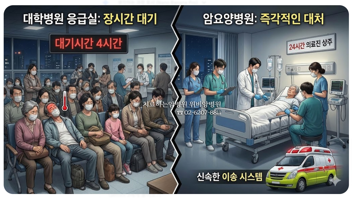 항암 치료 중에는 면역력이 급격히 떨어져 감염 위험이 높습니다. 집에서 고열이나 극심한 통증이 발생할 경우, 대학병원 응급실을 방문하더라도 장시간 대기해야 하는 문제가 있습니다. 암요양병원은 의료진이 24시간 상주하므로 응급 처치가 가능하며, 필요시 연계된 상급종합병원으로의 신속한 이송 시스템을 갖추고 있습니다.