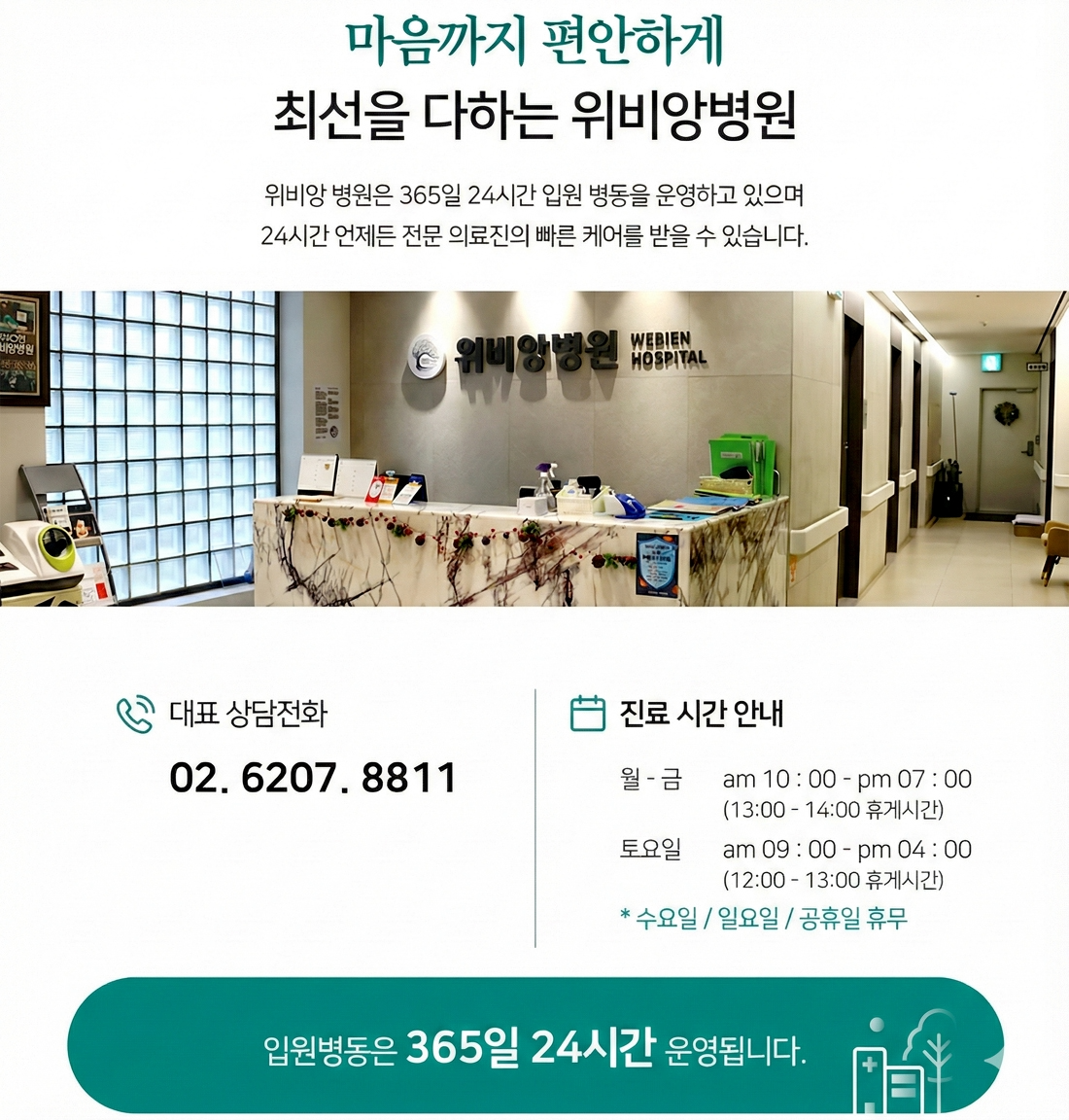 “새로운 회복의 시작, 건강을 위한 동행” 위비앙병원| 상담문의 : 02-6207-8811 (상담은 주말,공휴일도 가능합니다)