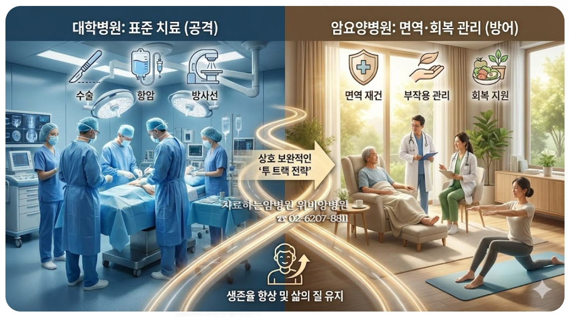 따라서 현명한 암 환자와 보호자는 '대학병원'과 '암요양병원'을 상호 보완적인 관계로 인식해야 합니다. 대학병원에서는 집도의를 믿고 표준 치료에 집중하고, 그 외의 회복과 면역 관리는 암요양병원에서 체계적으로 수행하는 '투 트랙 전략'이 암 생존율을 높이고 삶의 질을 유지하는 효율적인 방법입니다.