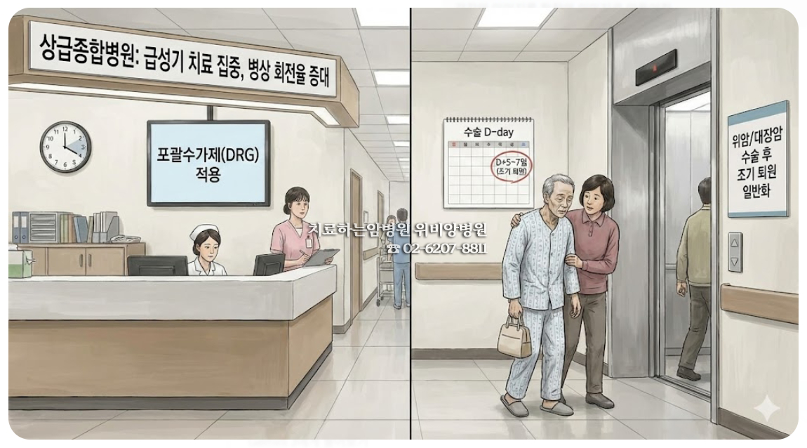 상급종합병원은 중증 환자의 수술과 급성기 치료에 집중하는 기관입니다. 병상 회전율을 높여야 하는 병원 운영 구조와 포괄수가제(DRG) 등의 제도적 요인으로 인해, 수술 후 입원 기간은 점점 단축되고 있습니다. 위암이나 대장암 수술의 경우, 합병증이 없다면 수술 후 5~7일 이내에 퇴원하는 것이 일반적인 프로토콜입니다.